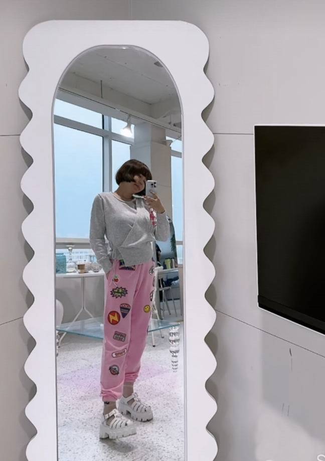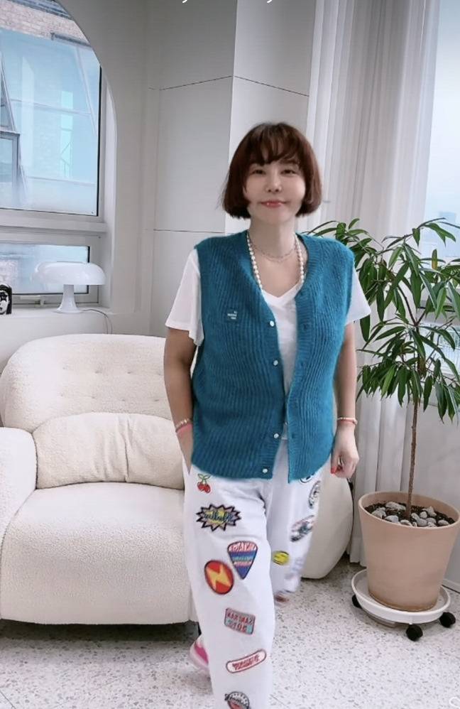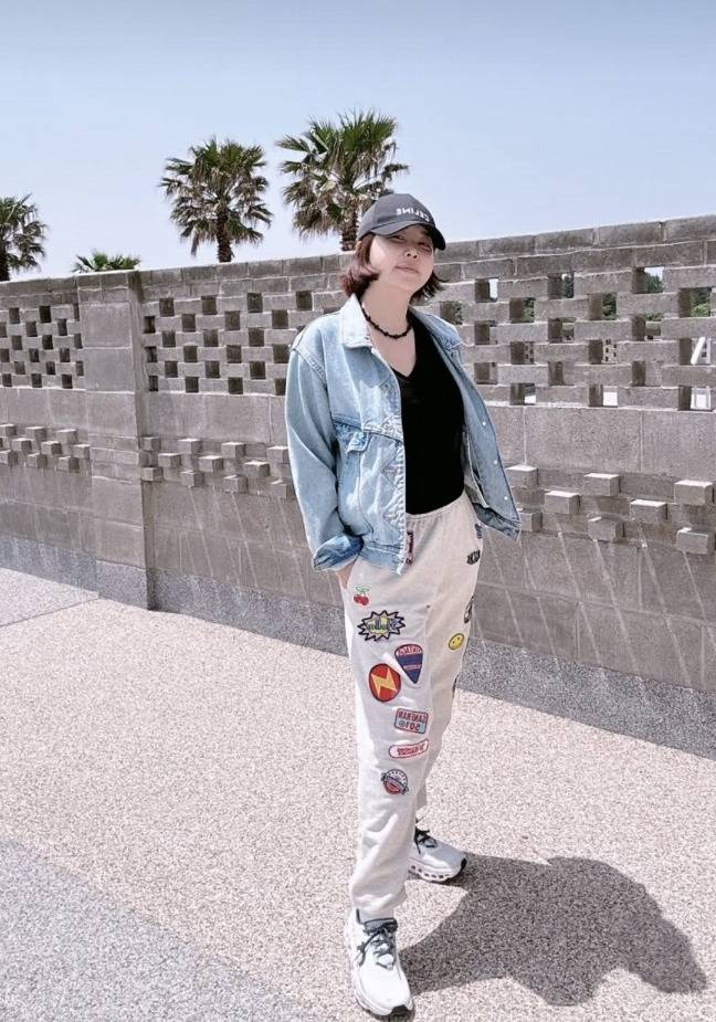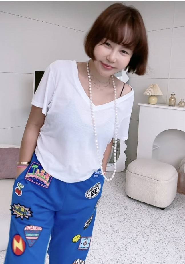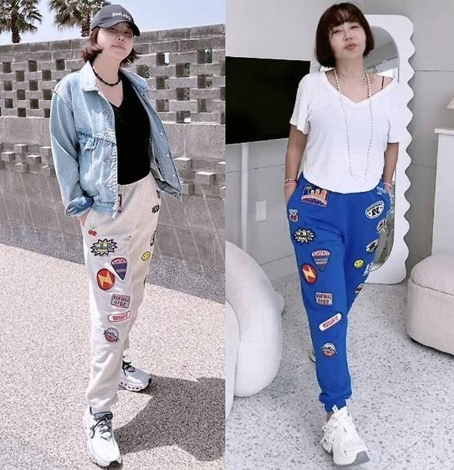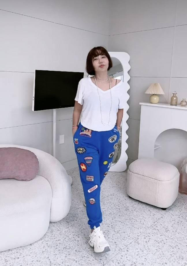 황혜영은 기본적인 티셔츠와 조거 팬츠를 활용해 편안하면서도 감각적인 스타일을 완성했습니다.