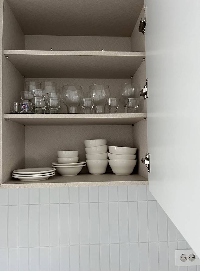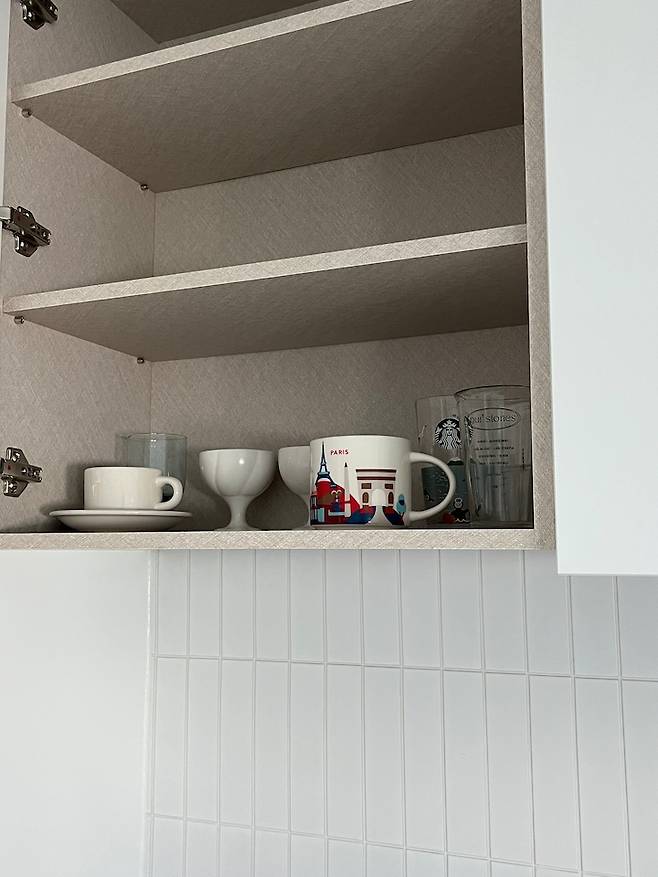 자주 쓰는 식기는 손이 잘 닿는 아래 칸에 두어서 사용 중이에요.