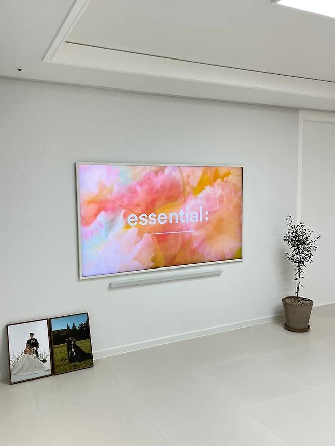 프레임 티비는 밀착 시공으로 더 깔끔하게 보이도록 했습니다. TV 하부가 답답해 보이지 않게 TV 장은 두지 않았고 대신 아래에 웨딩 촬영 액자를 툭- 두었어요. 인테리어 효과가 나는 거 같아 당분간은 이 자리에 두려구요.ㅎㅎ 로봇 청소기가 청소하면서 자꾸 쓰러뜨리는 단점이 있습니다. ಠ_ಠ