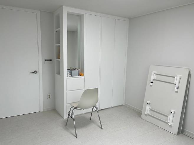 침실 외에 작은 방 2개가 있는데요. 한 방은 붙박이장이 있는 방으로 겨울 옷과 이불을 보관 중이에요. 추후 아이가 생기면 아이 방이 될 공간이랍니다. :D 거울이 있어 평소에 작은 방에서 스킨케어 및 화장을 해요. 조만간 집들이 예정이라 집들이용 테이블도 구매하여 작은 방에 두었어요. 아직 공간 활용이 가능해서 실내 큰 짐은 이 방에 두는 편이에요.