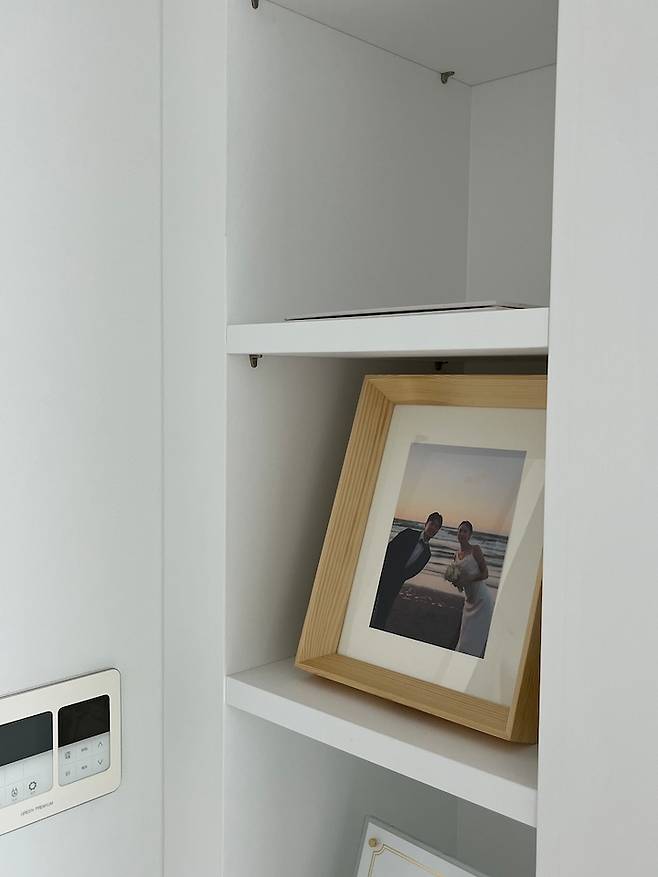 선반에는 명패와 웨딩 사진 액자, 혼인 서약서 등 올려두었어요.
