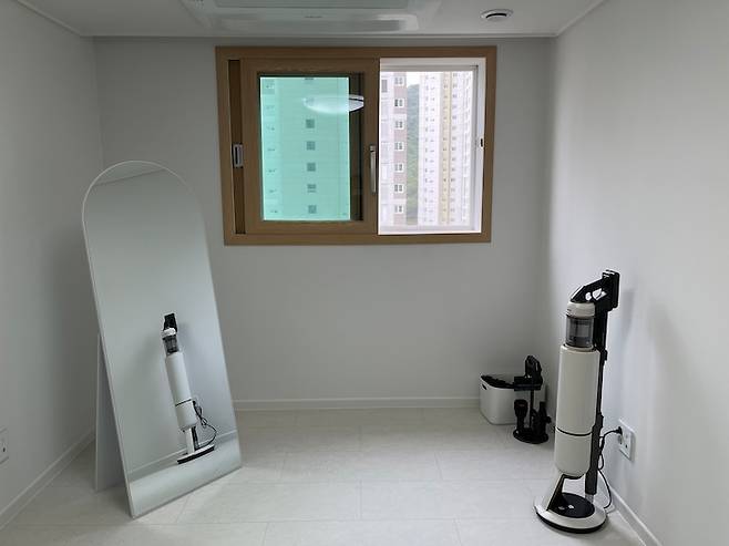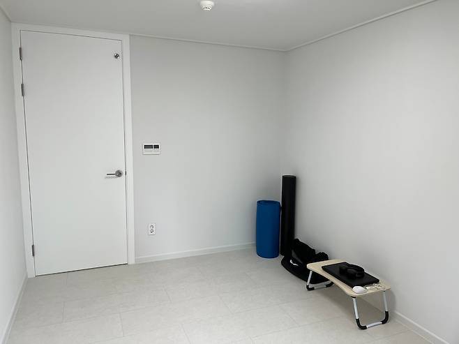 나머지 한 방은 행거를 설치하여 드레스 룸으로 사용할 예정이에요. 아직 비어있어 이렇게 청소기, 전신거울, 운동 용품 등을 두고 지내고 있어요. 작은 방들은 큰 가구가 없어 게스트 룸으로도 사용 중이에요.
