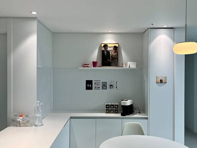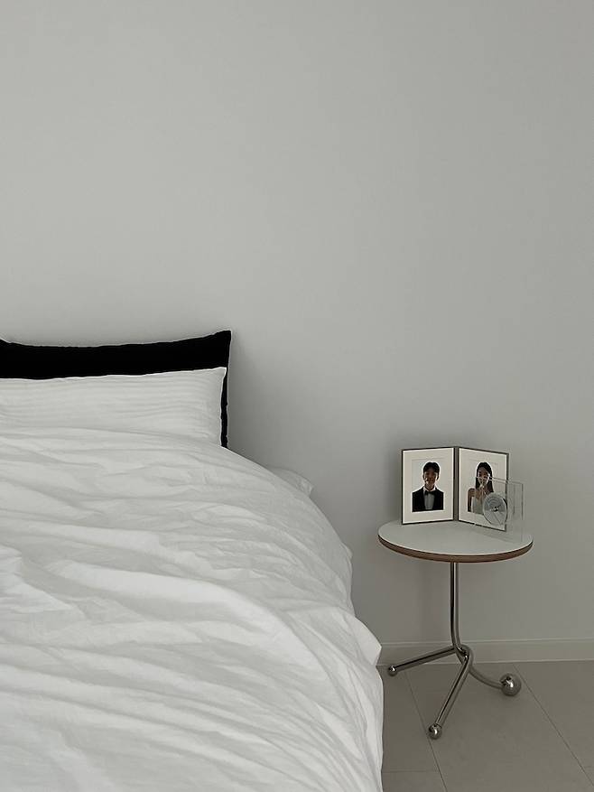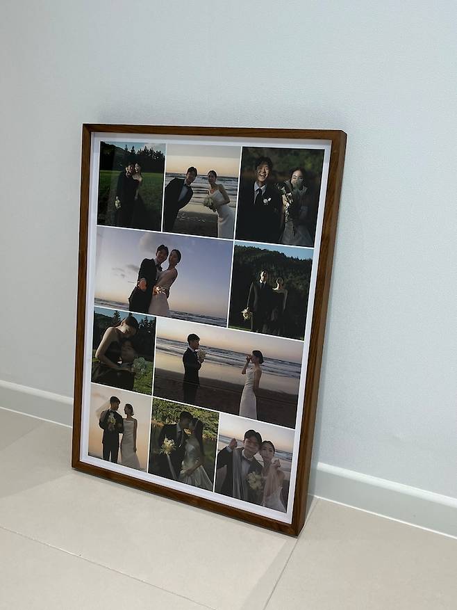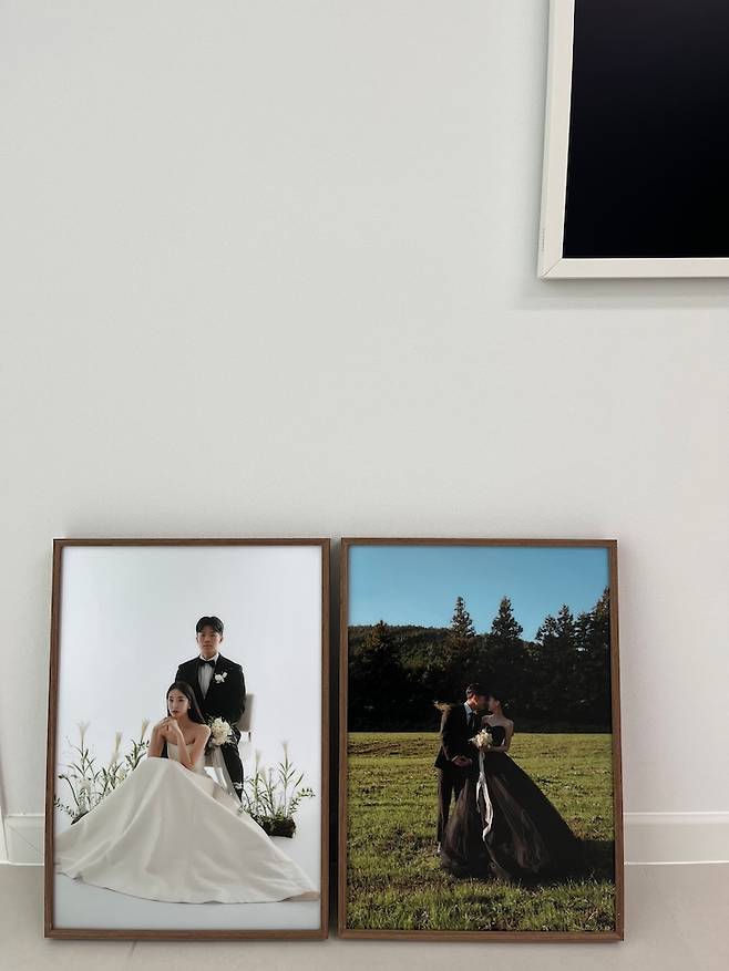 한 쪽 벽엔 저희의 웨딩 사진 액자를 두었어요. 원하는 사진을 선택하여 원목 액자로 제작하였는데 넘 고급스럽고 만족스러워요.👍👍