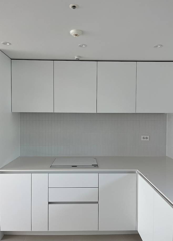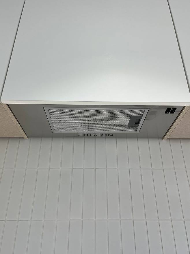 상부장 왼쪽에서 두번째 칸이 후드입니다. 주방 리모델링에 기본 후드가 포함되어있어 타 제품으로 변경하지는 않았어요.