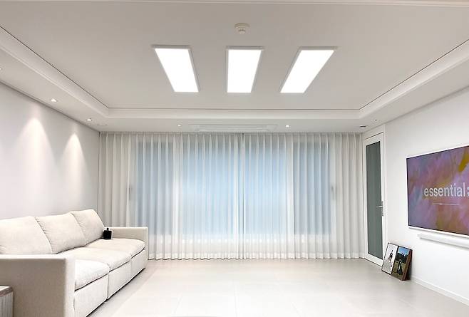 거실은 아트월을 철거하고 실크 벽지로 도배, 타일 시공, 간접 조명 시공, 천정 우물 필름 시공, TV 밀착 시공을 했습니다.