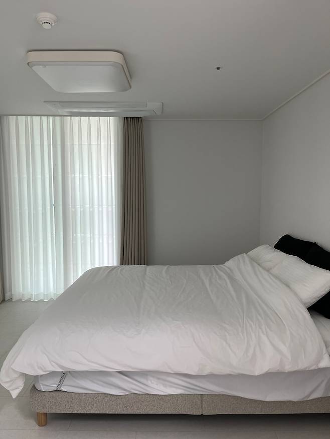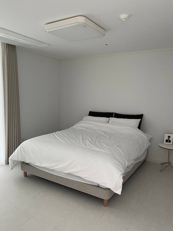 어두워야 잘 수 있는 저희 부부는 쉬폰 + 암막 이중 커튼으로 설치했어요. 평소엔 쉬폰 커튼만 쳐두고, 자기 전에 암막 커튼을 필수!로 치고 잡니다. 잠잘 때 외에는 주로 거실에서 지내기 때문에 무드등도 따로 두진 않았어요.