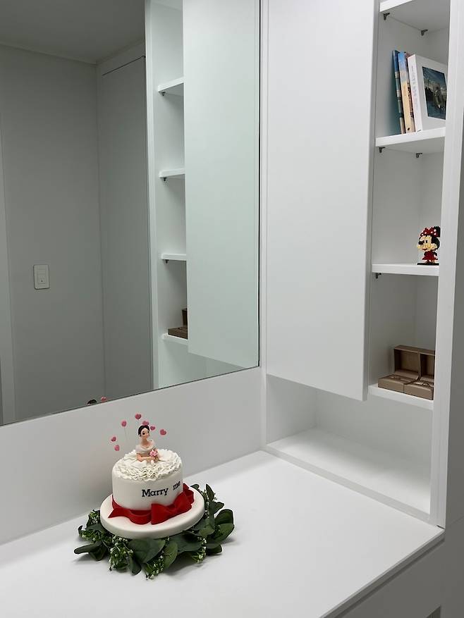 화장대는 프러포즈 때 받은 설탕 케이크 자리 입니다..❤ 저는 작은 방, 남편은 화장실에서 주로 스킨 케어 및 화장을 하기 때문에 화장대가 복잡하지 않아요. 습하지 않은 곳에 둬야 해서 항상 제습기를 틀어놓는 드레스룸 근처인 화장대에 두었어요.