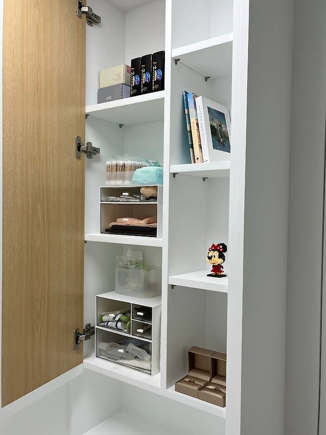 오른쪽엔 결혼 반지와 8년 전 저희의 추억인 미니를 두었고 왼쪽 안 보이는 수납장엔 새 화장품, 리필 제품 등 정리해두었어요.