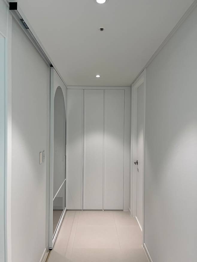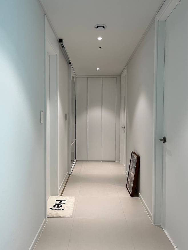현관 바로 앞 붙박이 장은 외출 직전에 자주 찾는 물건, 마스크, 가벼운 외투(행거가 있어요) 등 넣어두어 수납 효과를 톡톡히 보고 있습니다. 일반 벽이었다면 액자를 걸고 선반을 두고 꾸미는 맛도 있었을 거 같아요. 조명을 키면 넘 이쁜 복도.