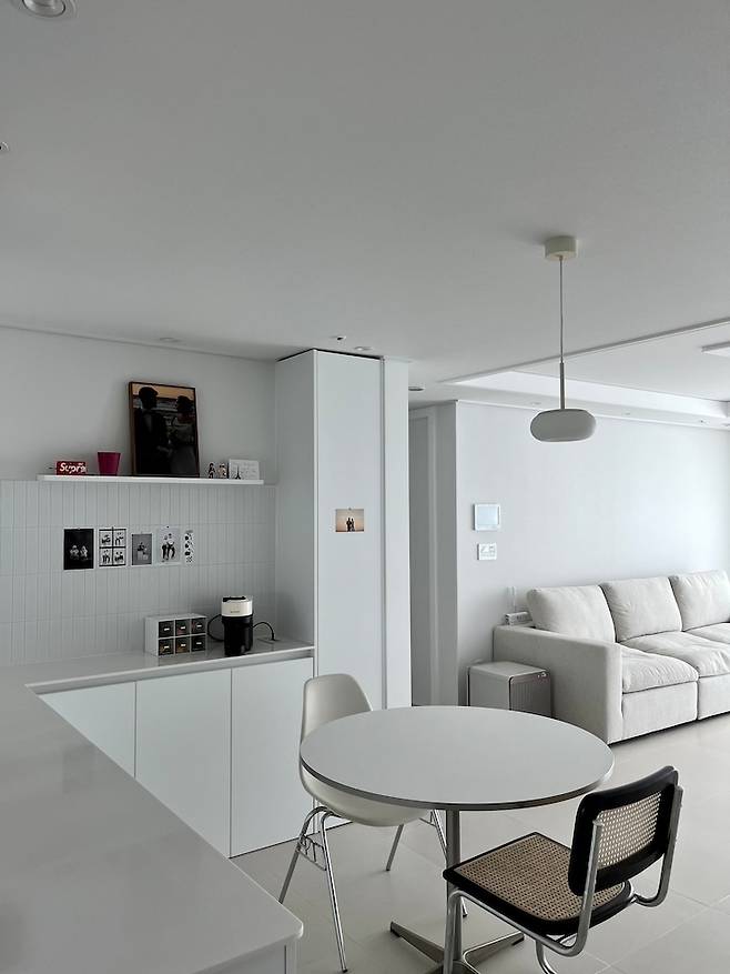 의자는 언밸런스한 게 더 매력 있게 느껴져 다른 제품으로 구매했고 테이블 다리가 실버라 이에 맞춰 의자 다리도 실버로 된 제품으로 골랐어요. :) 동글동글 귀여운 모찌 조명은 차가워 보이는 저희 집에 약간의 둥글둥글 포근한(?) 분위기를 주는 거 같아요.