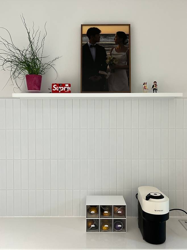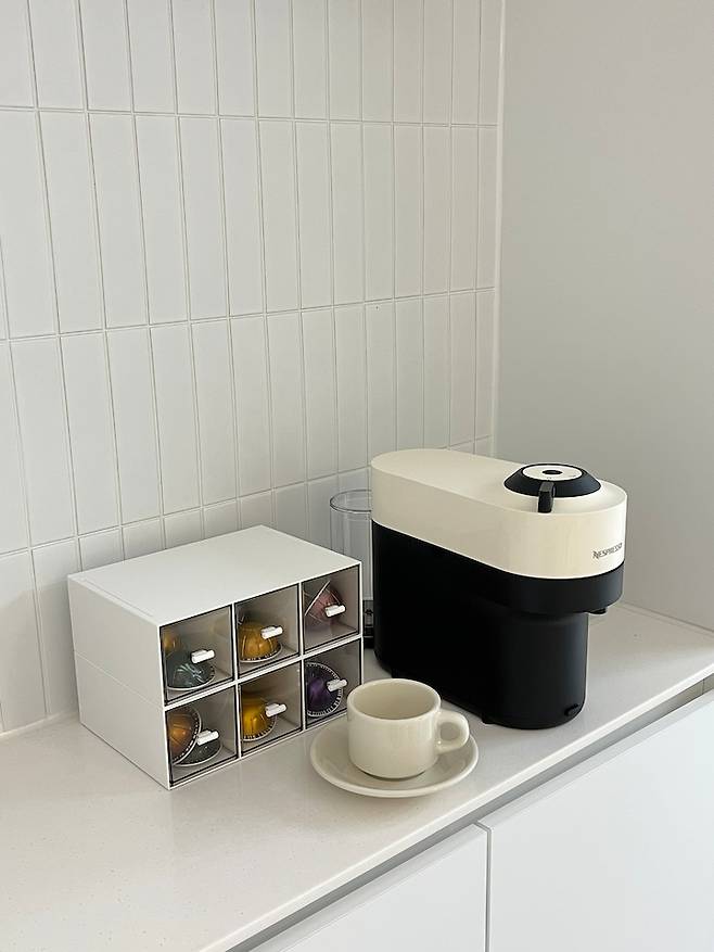 네스프레소 버츄오 팝 커피 머신을 선물 받았어요. 다른 캡슐과 호환이 안되지만 네스프레소 캡슐만 35가지가 넘어서 다양하게 맛 볼 수 있는 점이 큰 장점인 거 같아요! 빌트인 콘센트를 설치해서 전선을 짧게 하여 외관상 깔끔하게 사용 중입니다.