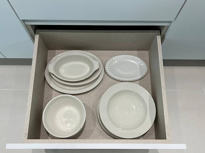 무거운 식기는 하부장 슬라이딩 서랍에 두었습니다. 상부장에 두는 것보다 손목에 무리도 안 가고 위험하지 않은 것 같아요.