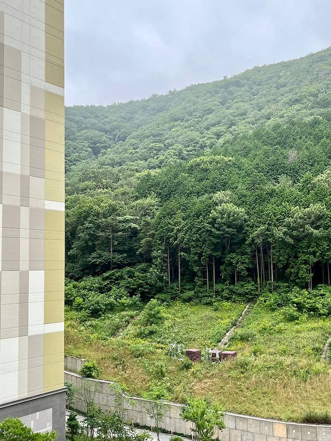 아파트 뒤에 산이 있어 거실 대각선으로 초록 초록한 뷰를 즐길 수 있어요.