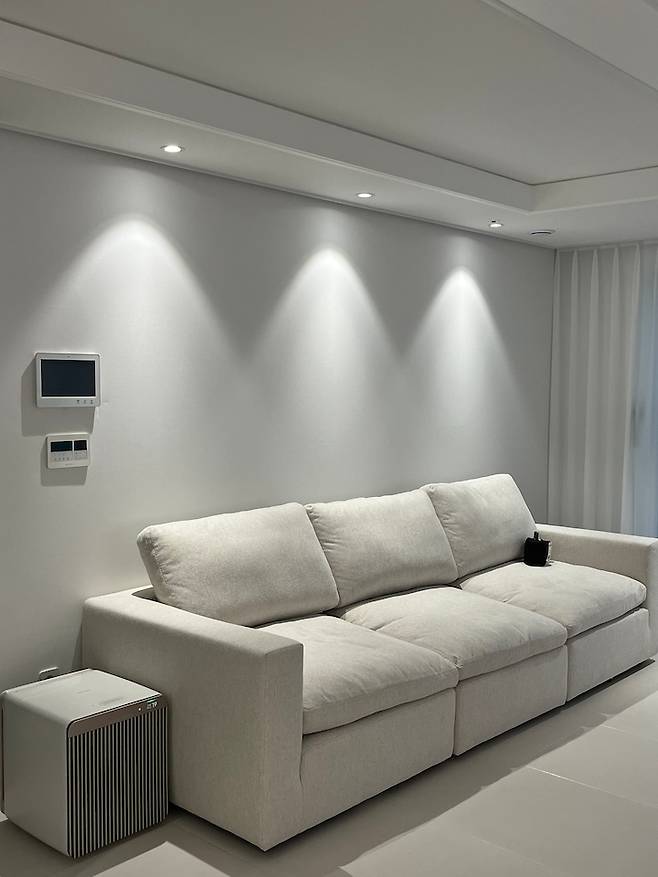 은은하게 있고 싶을 때(?) 이 조명만 키고 있어요. 소파는 온라인 전용 제품이라 실제로 보지 않고 구매해서 저희 집과 어울리지 않으면 어쩌나 고민 많이 했는데 찰떡인 거 같아요!