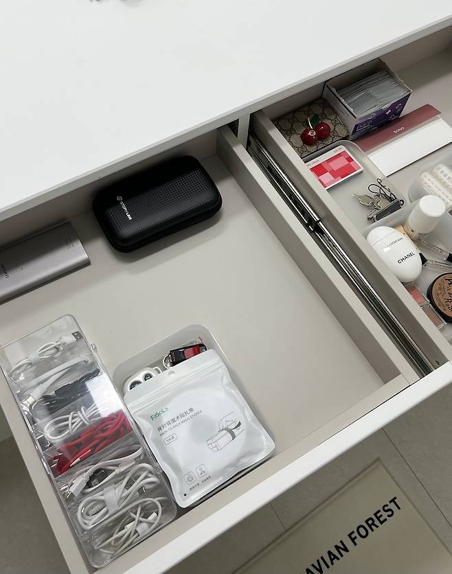 화장대 하부 서랍엔 전자 기기 관련 / 기타 물품을 나눠 두었어요. 케이블 케이스 & 선 정리 찍찍이 정말 강추드려요! 케이블 한,두 개만 나와있어도 지저분해 보이는데 이렇게 칸칸이 정리를 해두니 너무 깔끔해요.