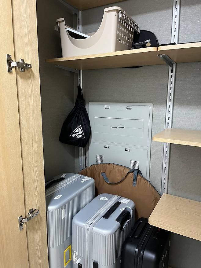 현관에 있는 팬트리에는 캐리어, 캠핑 용품 등 부피가 큰 것들과 잡동사니들을 넣어두었어요. 큰 짐이 많은 저희 부부에겐 팬트리가 정말 도움 되는 공간이에요.