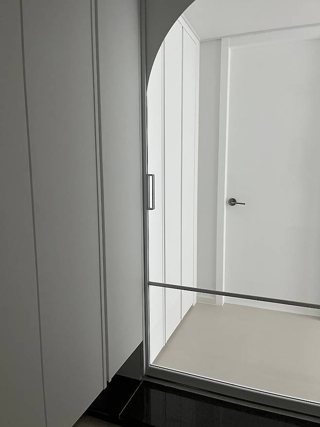 중문은 투명으로 하여 개방감을 주었고 아치형으로 포인트를 줬습니다. 입구에 바로 있는 붙박이장 이용에 불편함이 없도록 슬라이딩 도어로 설치했어요.