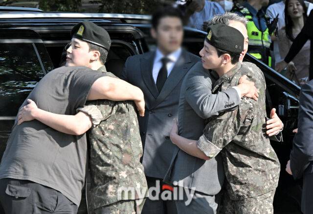 [마이데일리 = 연천(경기도) 송일섭 기자] 방탄소년단(BTS)의 정국과 지민이 11일 오전 경기도 연천군 연천공설운동장에서 진행된 전역식에서 지인들과 포옹을 하고 있다.
