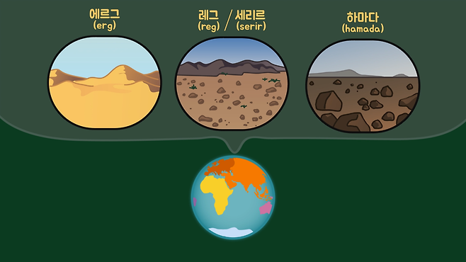 나머지는 레그(reg) 또는 세리르(serir)라고 불리는 자갈사막과 하마다(hamada)라고 불리는 암석사막 등이고, 이러한 사막은 아프리카뿐만 아니라 남극과 북극을 포함한 일곱 개 대륙 모두에 존재합니다.