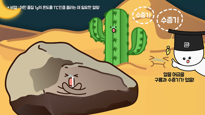 낮에 태양 빛을 받으면 30℃에서 50℃까지 올라가다가 밤이 되면 0℃에서 영하까지 급격하게 떨어집니다. 그 이유는 모래의 비열이 작아서 쉽게 뜨거워지고 차가워지며 대기 중에 구름과 수증기가 없어서 밤에 복사냉각이 활발하게 이루어지기 때문입니다.