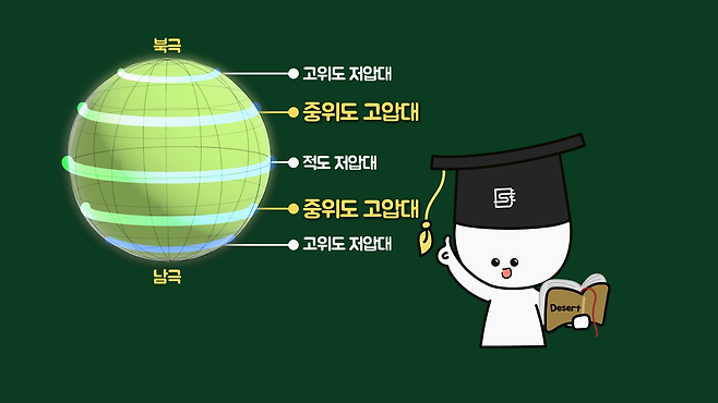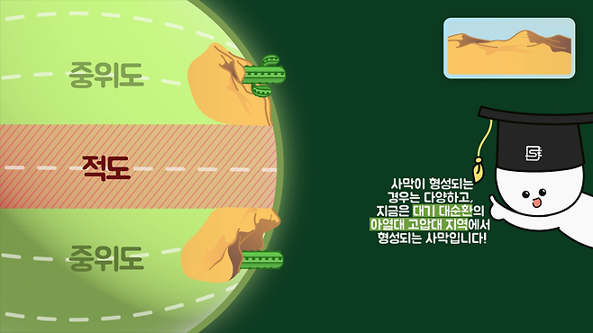 각설하고, 주제와 관련한 사막은 중위도 고압대인 위도 30~50° 부근에서 주로 형성되는 모래사막입니다. 모래사막이 형성되는 과정을 알아보면 먼저 태양 빛을 많이 받는 적도에서 따뜻한 공기가 상승하면서 시작됩니다.