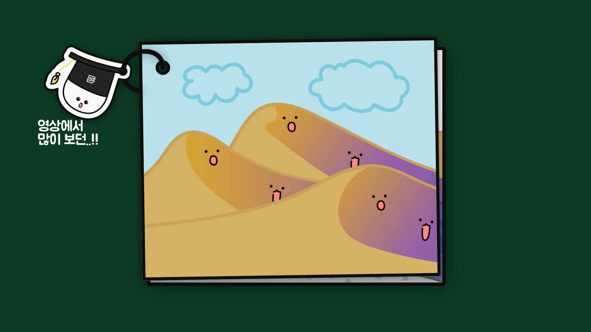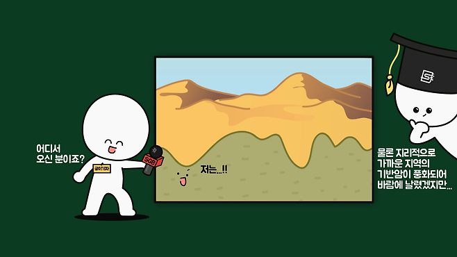 그런데 잘 생각해보면 암석마다 풍화되는 정도가 제각각입니다. 이런 이유로 풍화가 적게 이루어진 무거운 모래와 자갈 등은 바닥에 위치하고, 풍화가 많이 된 가볍고 미세한 모래는 표면에 위치하게 되는데, 이들이 바람에 의해 날려 쌓이면 물결 모양의 모래 언덕인 사구가 형성됩니다.