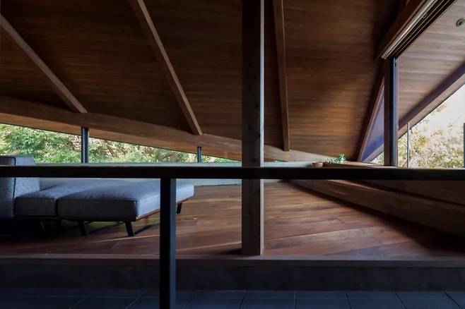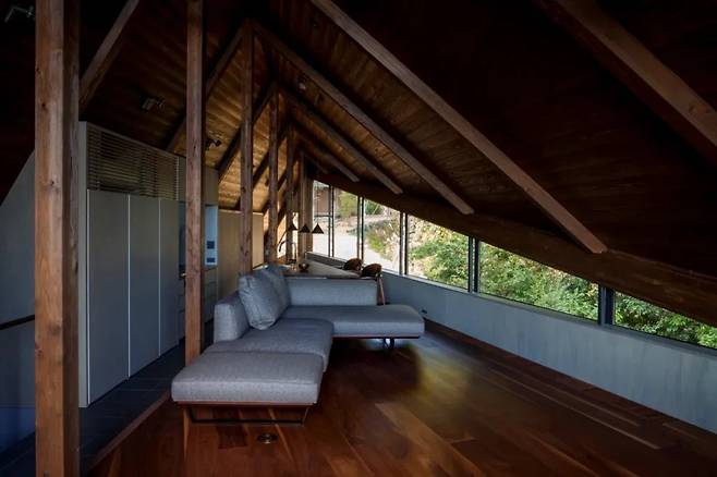 거실 쪽으로 내려오는 천장은 텐트의 덮개를 닮은 깊은 처마로 설계되어 빛을 조절한다. 연속된 창문은 자연 환기를 고려한 설계로, 바다와 숲의 경치를 모두 즐길 수 있는 이중 창은 아늑함과 개방감을 동시에 준다.