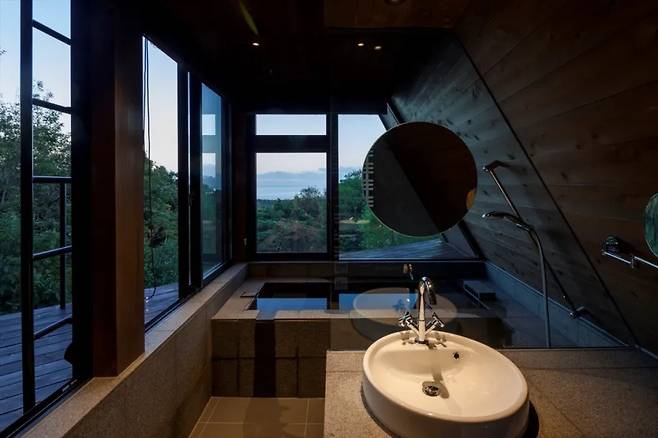 바다를 향한 위치에는 테라스가 있으며, 두 면이 유리로 이루어진 욕실과 연결된다. 온천수가 흐르는 구조로, 노천탕의 개방감을 주며 세련된 인테리어가 인상적이다.