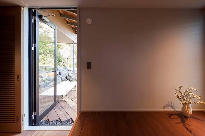 1층은 거실 아래에 위치하고, 별도의 테라스를 통해 정원으로 바로 나갈 수 있다. 외부에는 현관과 정원을 연결하는 넓은 타일 포장로가 있으며, 2층의 욕실이나 화장실로 바로 이어지는 독립적인 동선이 있어 일상과 휴식의 경계를 유연하게 만든다.