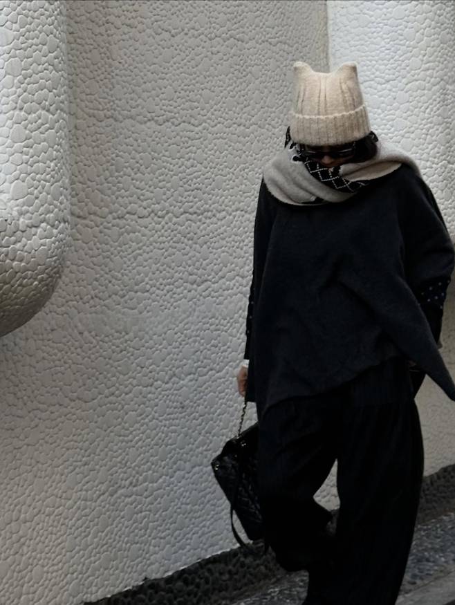 평범한 비니가 아니라 고양이 귀를 연상시키는 뾰족한 디테일이 살아있는 모자를 선택해, 럭셔리한 룩에 위트와 귀여움을 동시에 더했는데요.