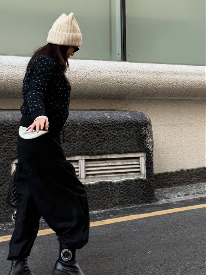 이번 코디의 가장 놀라운 반전 포인트는 바로 머리에 쓴 크림색 비니예요.