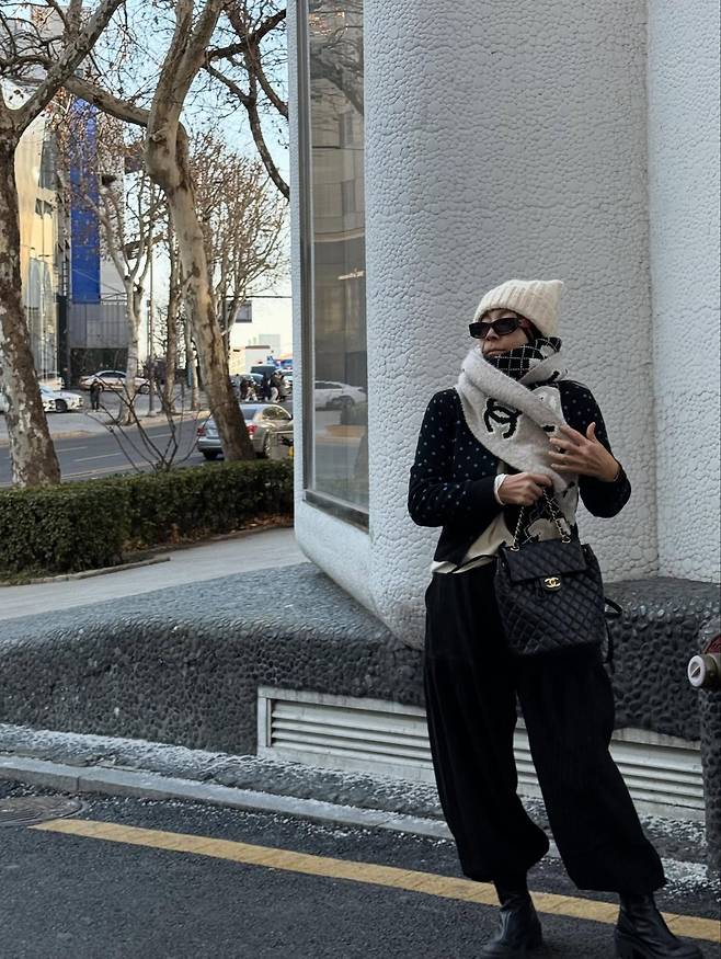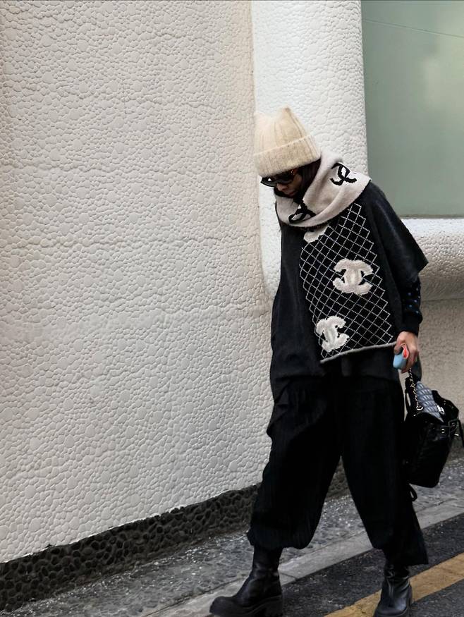 사진 속 황신혜는 거친 질감의 벽면을 배경으로 걷고 있는데, 단연 시선을 강탈하는 것은 화이트 컬러의 로고가 큼지막하게 박힌 명품 브랜드의 머플러와 베스트예요.