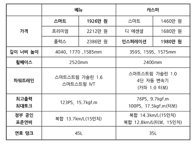 겹치는 가격대로 볼 수 있는 지점은 베뉴 스마트와 캐스퍼 인스페레이션입니다. 엔트리 트림과 최상위 트림인데요, 가격 차이는 54만 원. 아무리 작은 SUV라고는 하지만 경차와는 차이는 큽니다. 베뉴가 445mm 더 길고 175mm 더 넓으며 10mm 더 높습니다. 휠베이스 차이는 120mm. 엔진과 변속기의 조합도 다릅니다. 배기량도 다르지만 무엇보다 캐스퍼는 터보 엔진을 추가할 수 있습니다.