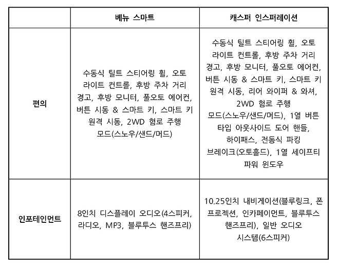 베뉴 스마트 트림은 1926만 원으로 캐스퍼 인스퍼레이션보다 약 50만 원 저렴합니다. 소형 SUV 깡통과 경차 풀옵션, 구성만 놓고 보면 어떨까요?