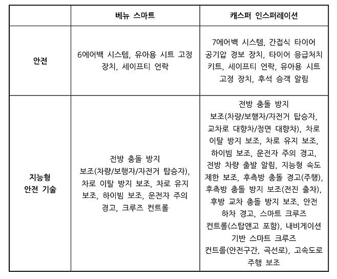 베뉴에 장착되는 에어백은 1열 어드밴스드, 1열 사이드 에어백, 전복 대응 커튼이고, 캐스퍼는 1열, 센터 사이드, 사이드, 전복 대응 커튼입니다. 센터 사이드 에어백이 있고 없고의 차이로 보면 될 것 같고요. 지능형 안전 기술에선 차이가 큽니다. 전방 충돌 방지 보조의 범위를 비롯해서 후측방 충돌 방지 보조, 전방 차량 출발 알림, 스마트 크루즈 컨트롤, 고속도로 주행 보조 등 캐스퍼의 구성이 나아 보입니다. 참고로 베뉴에선 스마트 크루즈 컨트롤이 프리미엄부터 기본인데 스톱 앤 고 기능이 포함되진 않습니다. 내비게이션 기반 스마트 크루즈와 고속도로 주행 보조도 스톱 앤 고처럼 베뉴에선 누릴 수 없는 기능입니다.