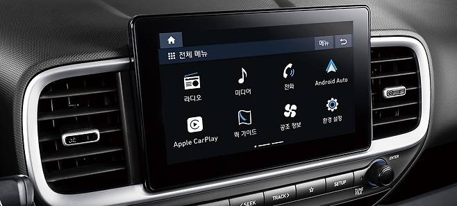 풀 오토 에어컨, 스마트 키, 원격 시동 등 편의 사양을 챙긴 트림이라도 해도 베뉴 스마트는 캐스퍼 인스퍼레이션에 비하면 부족해 보입니다. 오토홀드 기능이 포함된 전동식 파킹 브레이크, 하이패스, 10.25인치 내비게이션, 블루링크 등이 대표적입니다. 베뉴의 8인치 디스플레이 오디오는 유선 폰 프로젝션을 지원합니다. 내비게이션은 아닙니다.