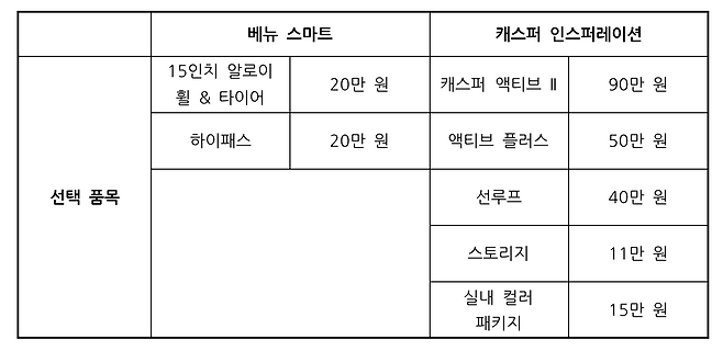 베뉴의 옵션은 단출합니다. 스틸 휠 대신 알로이 휠로 변경이 가능하고 하이패스 시스템을 추가할 수 있습니다. 캐스퍼는 카파 1.0 터보 엔진과 라디에이터 그릴 크롬 테두리로 구성된 액티브 II를 포함해서 5개의 옵션이 있는데요. 액티브 플러스는 액티브 II를 추가해야만 선택권이 주어집니다. 17인치 다크 그레이 알로이 휠과 리어 스포일러로 차별화된 외관을 꾸밀 수 있는 선택 품목입니다. 스토리지엔 C 필러 러기지 볼팅과 동승석 시트백 보드가 묶여 있고 새롭게 추가된 베이지/오렌지 브라운 실내 컬러는 15만 원입니다. 적용 범위는 시트, 스티어링 휠, 크래시 패드, 도어 암 레스트, 센터 콘솔, 헤드라이닝입니다.