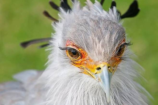 속눈썹이 유난히 긴 이유는 생존과 연결돼 있다고 합니다. 사막을 누비는 뱀잡이수리 특성상 눈에 모래가 들어갈 경우 위험할 수 있습니다.