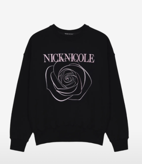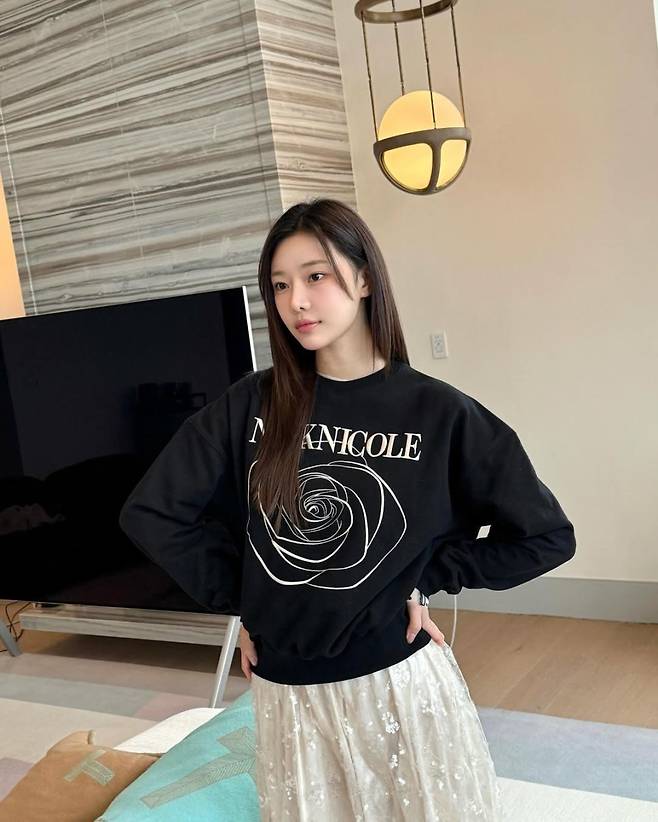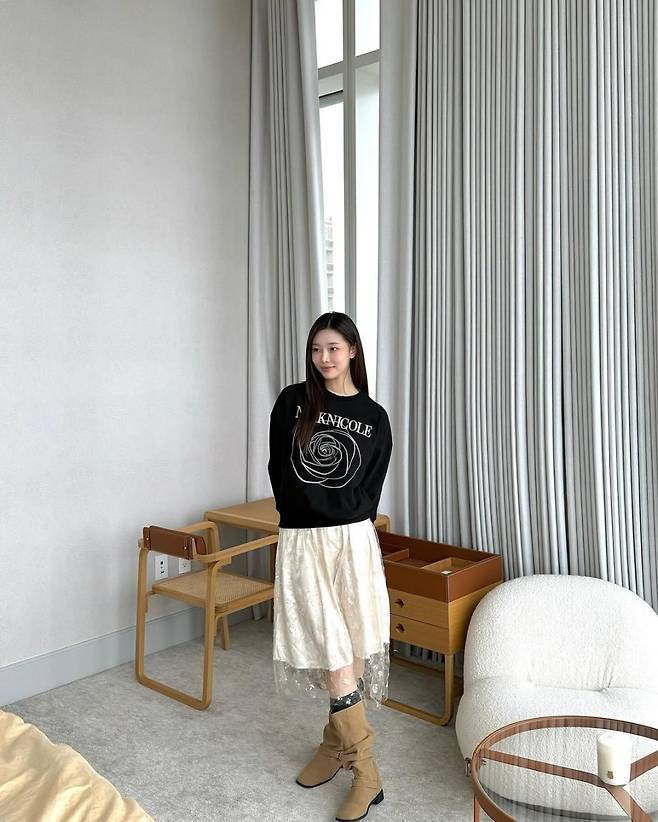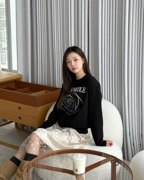 이시안은 큼직한 로즈 그래픽이 인상적인 블랙 스웨트셔츠 위에, 은은하게 드러나는 레이스 디테일이 돋보이는 시스루 스커트를 레이어드해 입었어요.