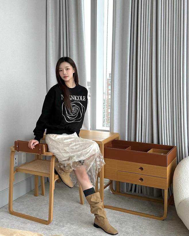 또한, 베이지 컬러의 웨스턴 부츠가 캐주얼함과 고급스러움을 동시에 연출하며, 이시안만의 독특한 감각을 완성했답니다. 여자 맨투맨 코디의 정석을 보여준거죠.