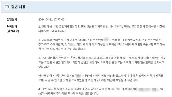 공정위는 “우리 위원회가 운영하는 ‘전자상거래 등에서의 소비자 보호에 관한 법률 제21조 제1항 제1호’에서는 거짓 또는 과장된 사실을 알리거나 기만적 방법을 사용하여 소비자를 유인 또는 소비자와 거래하는 행위를 금지하고 있다”며 “피민원인이 실제로 B마켓에서 허위 리뷰 작성을 유도해 마치 많은 소비자가 해당 제품을 구매, 사용 후 만족한 것처럼 조작했을 경우 전자상거래법 위반에 해당할 수 있다”고 설명했다.