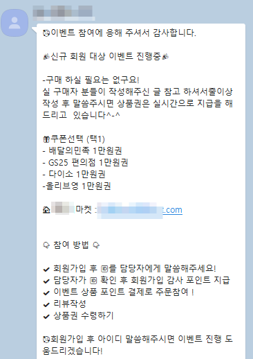 A실장은 카카오톡을 통해 이벤트 참여방법을 안내하겠다며 자신의 카카오톡 ID를 불러줬다. 해당 ID로 카카오톡을 보내니 곧바로 쇼핑몰 주소와 이벤트 참여방법이 적힌 카카오톡 메시지를 받을 수 있었다. 안내 받은 쇼핑몰 ‘B마켓’은 당연하게도 네이버 스마트스토어와는 전혀 관계가 없는 외부 사이트였다.