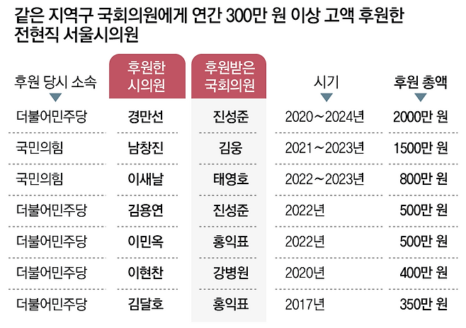 후원 총액이 가장 컸던 이는 2018년 7월부터 4년간 재직한 더불어민주당 경만선 전 시의원(강서)이다. 경 전 시의원은 2020∼2024년 같은 당 진성준 의원(강서을)에게 4차례에 걸쳐 총 2000만 원을 후원했다. 시의원 신분이던 2020년, 2021년뿐 아니라 2022년과 2024년에도 연간 한도인 500만 원을 꽉 채워 보냈다. 경 전 시의원과 진 의원은 지역구가 겹치고, 김포국제공항 고도 제한 완화 등 지역 숙원 사업에서 긴밀히 공조해 왔다. 경 전 시의원과 같은 시기 재직한 김용연 전 시의원(강서)도 2022년 11월 진 의원에게 500만 원을 후원했다.