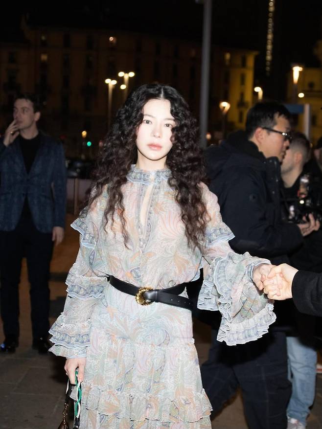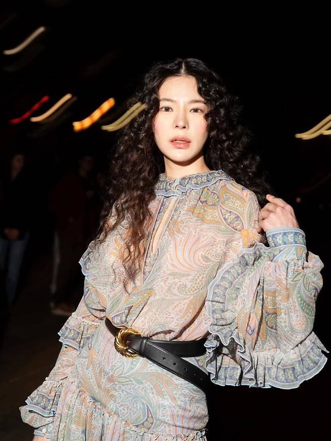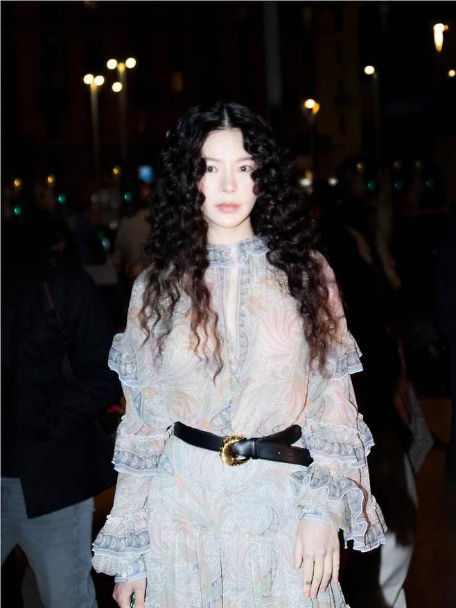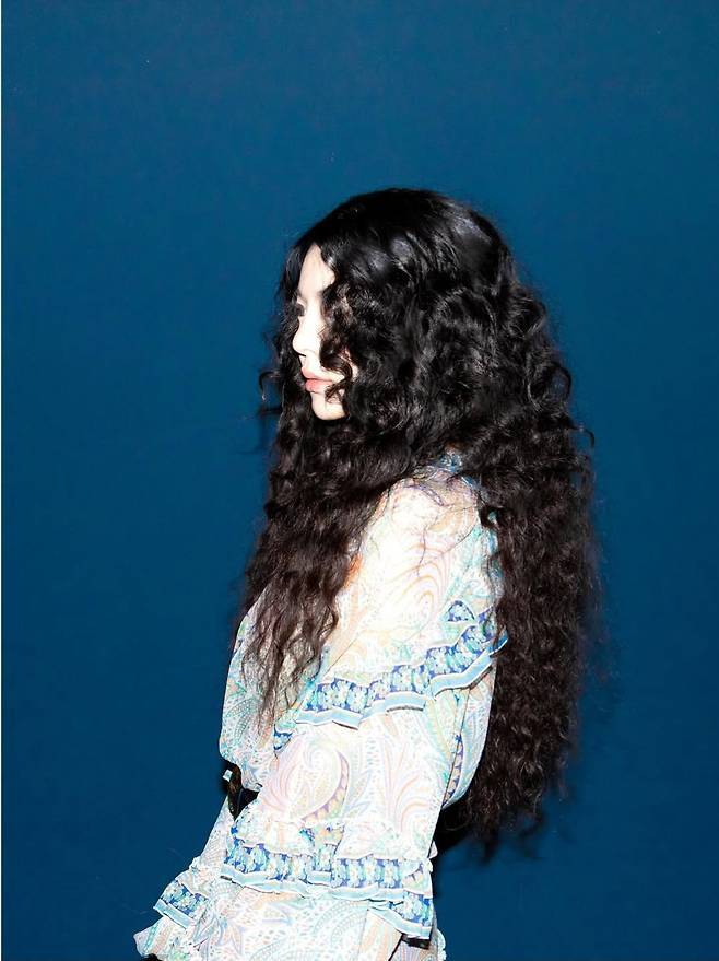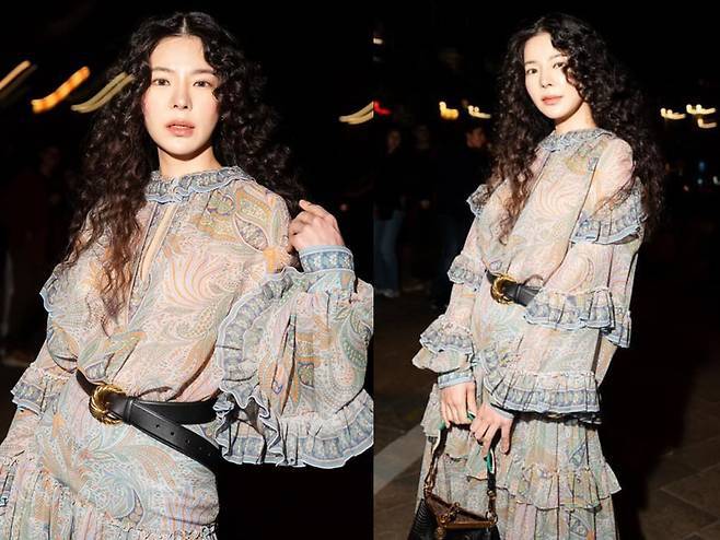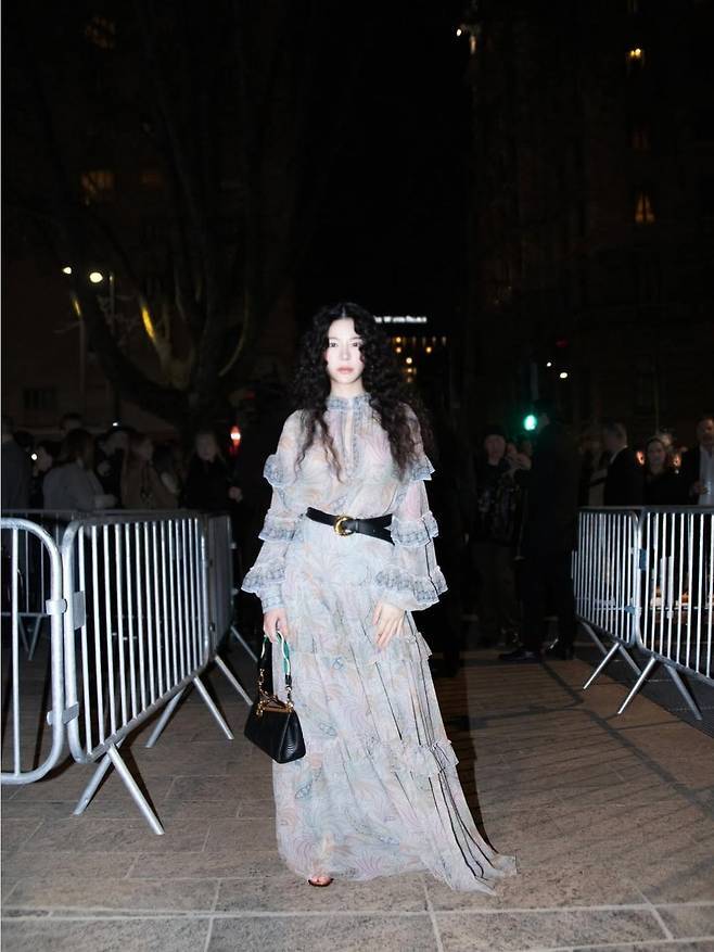 여기에 강렬한 곱슬 웨이브 헤어와 생기 있는 치크 메이크업으로 시선을 사로잡으며, 특유의 몽환적인 분위기를 한껏 끌어올렸습니다.