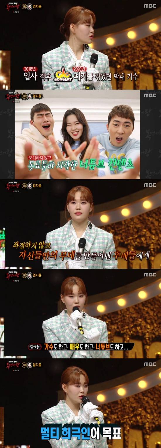 25일 방송된 MBC '복면가왕'에서는 '며느리 삼고 싶은 1등 가왕감! 상견례 프리패스상'의 정체가 엄지윤으로 밝혀진 장면이 전파를 탔다.