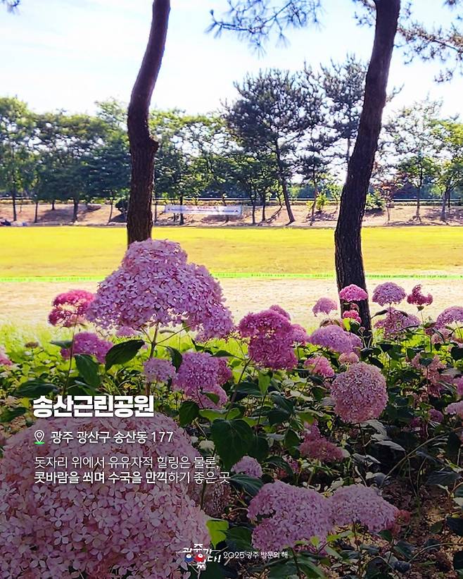 사계절 내내 피크닉 명소로 사랑받는 송산근린공원은 광주 시민들에게 익숙한 쉼터이자 자연 놀이터입니다. 공원 입구에 들어서면 왼쪽으로 펼쳐지는 수생식물원, 오른쪽의 플라타너스광장, 뒤편의 넓은 잔디광장이 각자의 개성을 자랑하며 방문객을 맞이합니다.