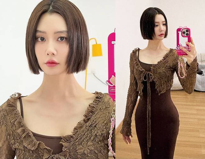 첫 번째 룩에서는 초밀착 시스루 브라운 레이스 크롭 카디건과 슬립 원피스로 섹시하면서도 소프트한 무드를 선보였습니다.