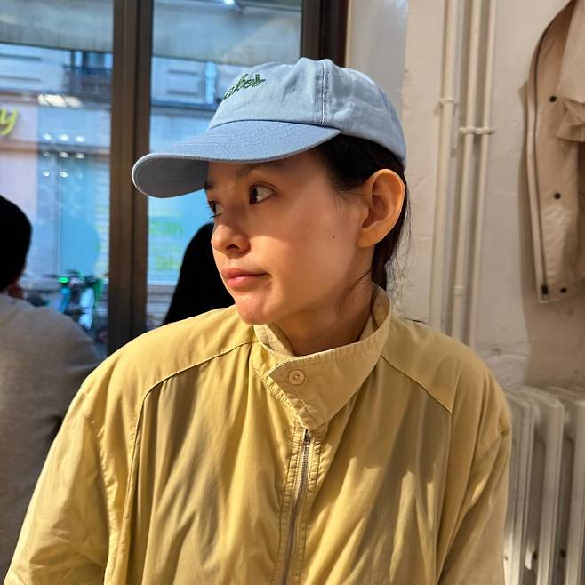 네 번째 사진에서는 연한 하늘색 캡과 베이지색 아우터를 착용해 편안하면서도 자연스러운 분위기를 연출했다. 아우터의 독특한 디자인은 실용적이면서도 스타일리시한 느낌을 강조하며, 모자의 컬러가 전체적인 톤을 부드럽게 연결해준다.