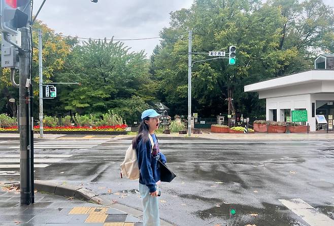 두 번째 사진에서는 청바지와 네이비 스웨트셔츠를 매치해 일상에서도 편안하게 활용할 수 있는 데일리 룩을 보여줬다. 하늘색 캡과 베이지 백팩은 실용성과 스타일을 동시에 잡으며, 비 오는 날씨와 어우러진 자연스러운 분위기를 자아낸다.