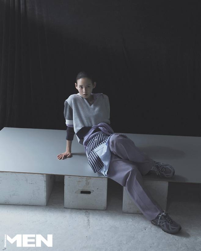 세 번째 사진에서 김윤혜는 회색 니트와 독특한 디자인의 팬츠를 매치해 현대적이고 실험적인 패션을 선보였다. 레이어드 디테일이 돋보이는 팬츠는 단순함 속에서도 개성을 드러내며, 전체적으로 미니멀하면서도 독창적인 스타일링을 완성했다.